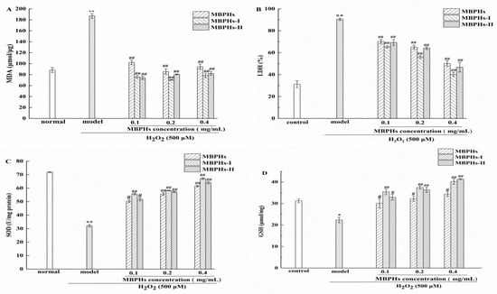 Cytoprotective effects of MBPHs, MBPHs-I, MBPHs-II, and MBPHs-II on H2O2-induced oxidized NCTC-1469 cells. Results are expressed as means ± SD (n = 6), ** p < 0.01 vs. control group, # p < 0.05 vs. model group, ## p < 0.01 vs. model group.