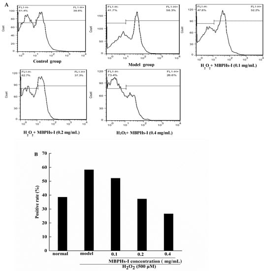 CFH-DA is a nonpolar dye and does not have fluorescence that can freely cross the cell membrane, but the DCFH-DA probe can be cleaved to DCFH by cellular esterases after diffusing into cells and being oxidized to DCF by peroxyl radicals produced by ABAP. DCF is based on fluorescence intensity and can be analyzed qualitatively or quantitatively. Therefore, the level of intracellular ROS can be reflected by the fluorescence intensity of DCF. The result was shown in Figure 5. Flow cytometry showed that the positive control of the model group was 58.3% and there was a much higher difference than the control group (38.6%). However, pre-treatment with MBPHs-I effectively prevented ROS generation. With the increase of concentrations, the effects of inhibition were also constantly strengthened. When the concentration of MBPHs-I was 0.1, 0.2, 0.4 mg/mL, the positive cell rates were 52.2%, 37.3%, and 26.6%. This indicted that MBPHs-I could effectively protect NCTC-1469 cells from the damage of free radicals.
