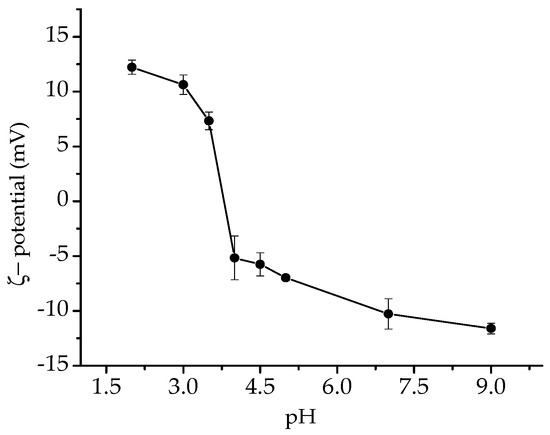 The isoelectric point of the P. serotine defatted flour was determined according to the theoretical determination of proteins and other macromolecules, through zeta potential (ζ-potential) which is the most direct characterization of the repulsion or attraction strength between their acid-base residues [40,41]. For this, a mixture of flour: deionized water in a 1:20 ratio (w/v) at different pH with 0.1 N NaOH and 0.1 N HCl was vortexed for two minutes. Zetasizer Nano ZS90 light scattering equipment (Malvern Instruments, Worcestershire, England, UK) was used. The measures were in automatic mode using a universal immersion cell (ZEN 1002, Malvern Instrument, Worcestershire, UK) at 25 °C. The results were reported as the average of three separate injections, with three measures per injection. The averages of triplicate values were used as the values for zeta potential reported.