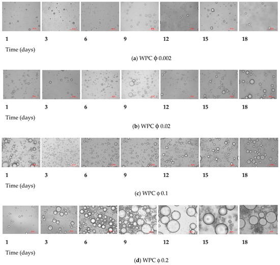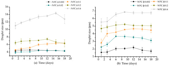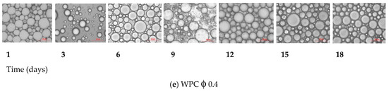 In Figure 4, it can be seen that emulsions with more oil content had the largest droplet size. As the days passed, the particle size increased when ϕ ≥ 0.2. In every PsPC emulsion, the maximum droplet size value was reached at different days, but it could be considered as average on day 10. While in WPC emulsions, the range of days to reach the maximum droplet size was more stable (between days 6 and 12), the particle size was more dispersed compared to the P. serotine protein.