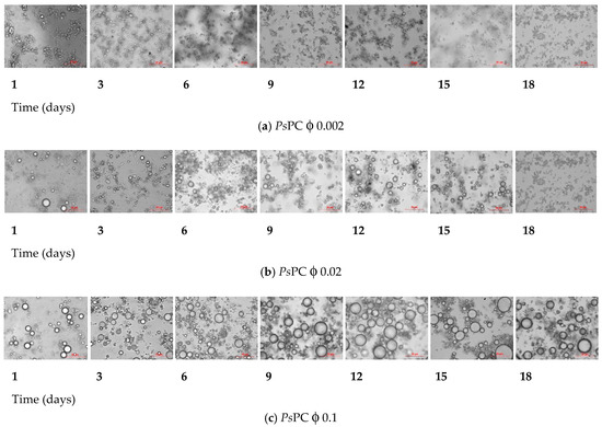 The microphotographs in function of PsPC and WPC are shown in Figure 6 and Figure 7, respectively. The images reflect the results of droplet size analysis. It shows that as the mass fraction of emulsions increased, the droplet size also decreased and began to show coalescence. Guo and Mu [1] report similar results. The maximum droplet size can be seen between day 9 and 12 in both emulsions.