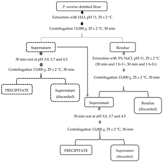 Proteins were extracted sequentially from P. serotine defatted flour according to the procedure described by Ramirez Pimentel et al. [35] and Raya Perez et al. [28], with the following solvents: distilled water (albumins), 0.5 M NaCl solution in 50 mM Tris pH 8 (globulins), 55% (v/v) 2-propanol (prolamins) and 0.1 M boric acid with 0.5% SDS pH 8 (glutelins).