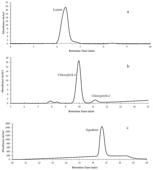 Methanol (MeOH), ethanol (EtOH), and acetonitrile (ACN), HPLC grade, and diethyl ether and petroleum ether, analytical grade, were purchased from Fischer Scientific (Geel, Belgium). 2-propanol and acetone, HPLC grade, were purchased from Honeywell (Offenbach, Germany). All the standard compounds (lutein, chlorophyll A 87%, β-carotene, α-tocopherol, γ-tocopherol, δ-tocopherol, and squalene) were purchased from Sigma Aldrich (Stenheim, Germany). Stock solutions containing 1000 mg/L of each analyte were prepared in methanol for lutein, in ethanol for β-carotene and tocopherols, in diethyl ether for squalene, and in acetone for chlorophyll, and stored at −20 °C during the study. Intermediate standard solutions of 100–500 mg/L of each compound were prepared in 2-propanol.
