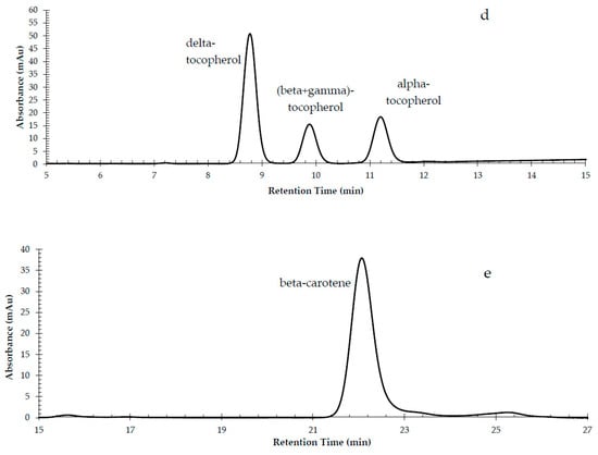 Chromatogram of a mixed standard solution of (a) lutein 1 mg/L, (b) chlorophyll a and a’ 10 mg/L, (c) squalene 250 mg/L, (d) δ-tocopherol 50 mg/L, (β + γ)-tocopherol 25 mg/L, α-tocopherol 25 mg/L, and (e) β-carotene 5 mg/L.