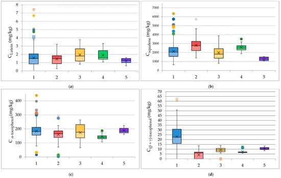 Box and whisker plots, presenting the concentrations of (a) lutein, (b) squalene, (c) α-tocopherol, and (d) (β + γ)-tocopherol according to the geographical origin. 1—Lesvos (n = 363), 2—Samos (n = 51), 3—Chios (n = 20), 4—Ikaria (n = 12), 5—Fournoi (n = 6).