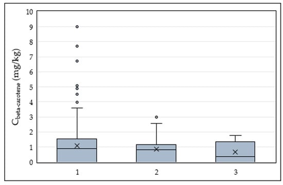 Box and whisker plot presenting the concentration of beta-carotene according to the island of origin. 1—Lesvos (n = 363), 2—Samos (n = 51), 3—Ikaria (n = 12).
