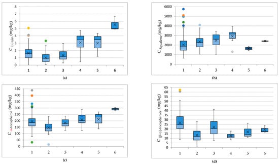 Box-and whisker plots presenting the concentrations of (a) lutein, (b) squalene, (c) α-tocopherol, and (d) (β + γ)-tocopherols in olive oil samples from different varieties. 1—Kolovi 60-100%, 2—Adramitiani 60-100%, 3—Kolovi:Adramitiani 50:50, 4—Koroneiki, 5—Ladoelia, 6- Local Wild Olive Tree.