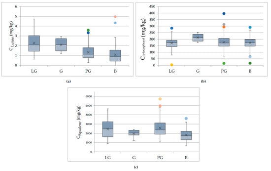 Box and whisker plots presenting the concentration of (a) lutein, (b) α-tocopherol, and (c) squalene in olive oils from Lesvos island regarding the maturity level of the fruit. Green (G, n = 4 samples), Light Green (LG, n = 24 samples), Purple-Green (PG, n = 67 samples), Black (B, n = 88 samples).