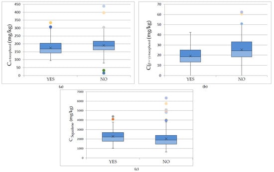 Box and whisker plots presenting the concentration of (a) α-tocopherol, (b) (β + γ)-tocopherols, and (c) squalene regarding to the addition of water during malaxation. YES (n = 120 samples), NO (n = 209 samples).