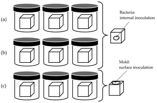 The experimental procedure for antimicrobial activity determination is depicted in Figure 1, and allows the investigation of microbial spoilage, in the case of an external contamination such as that occurring in ripening chambers with molds. Nine cheese cubes of 27 mm3 were obtained from each cheese using a cheese blocker (BOSKA, Bodegraven, Holland). The cubes were divided into three subgroups, with three cubes in each. Cubes were introduced into a sterile container and distributed as follows: Group 1, internal inoculation with C. tyrobutyricum at 103 cfu/g, incubated at 37 °C under anaerobic conditions (AnaeroGenTM, Oxoid LTD., Basingstoke, UK); Group 2, internal inoculation with E. coli at 103 cfu/g, incubated at 37 °C under aerobic conditions; Group 3, surface inoculation with P. verrucosum at 103 cfu/cm2, incubated at 25 °C under aerobic conditions. P. verrucosum was inoculated onto the surface, given its inability to grow in the interior of the cheese.