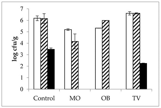 The antimicrobial activity results of the fortified and control cheese samples after one week of incubation are shown in Figure 3. The effect of EOs on Clostridium spp. remained relevant (Figure 3a). In the Group 1 cubes (inoculated with C. tyrobutyricum), the addition of O. basilicum and T. vulgaris reduced the clostridial counts by more than 1 log unit as compared with the control samples (4.04 log cfu/g), whereas the M. officinalis cheeses had no clostridial counts. In our previous study on the anticlostridial activity of M. officinalis EOs in laboratory media, we found that the concentration of these EOs required to achieve total inhibition was ten times lower [57]. These results are in accordance with the fact that higher concentrations of EOs are needed in food matrices compared with those used in in vitro testing, highlighting the importance of performing simultaneous studies in vitro and in situ [58]. This inhibitory effect on clostridial growth reached in this assay was more robust than that described by other authors such as Deans and Ritchie [59], who tested pure oils in vitro, and were unable to demonstrate inhibition of C. sporogenes with any of the three tested EOs. By contrast, Baratta et al. [36] reported inhibitions with O. basilicum oil on another clostridial species, C. perfringes, which overall suggests varying resistance among strains.