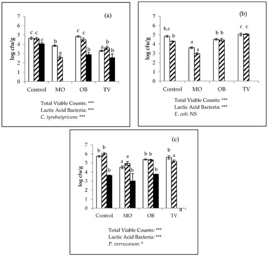 Antimicrobial activity assay performed by the inoculation of fortified cheeses with: (a) Clostridium tyrobutyricum (37 °C, anaerobic conditions), (b) Escherichia coli (37 °C, aerobic conditions) and (c) Penicillium verrucosum (25 °C, aerobic conditions).