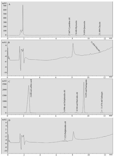 HPLC analysis of the obtained ginger water revealed that, among the nine standards used in the HPLC analysis, only chrysin and galangin were detected in the ginger water, at concentrations of 0.24 µg/mL and 0.53 µg/mL, respectively (Figure 1).