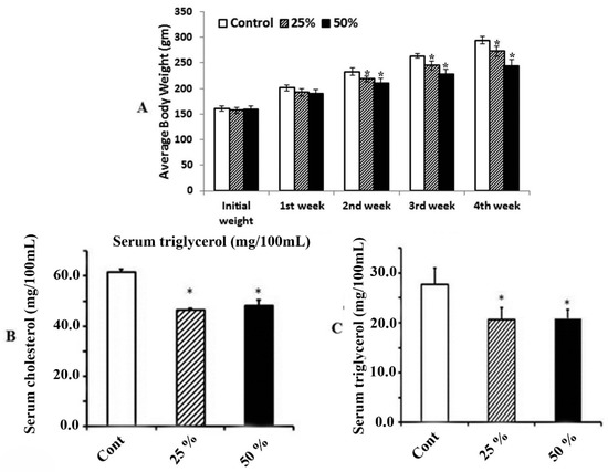 The effect of ginger water on body weight. Values are mean ± standard errors (SE) (n = 5). (A) Control, control group; 25%, 25% (v/v) ginger water-treated group; 50%, 50% (v/v) ginger water-treated group. The effect ginger water on serum level of (B) cholesterol and (C) triacylglycerol. Values are mean ± SE (n = 5). Cont: control, 25%:25% (v/v) ginger water-treated group, 50%:50% (v/v) ginger water-treated group. * p < 0.05 vs. the control.