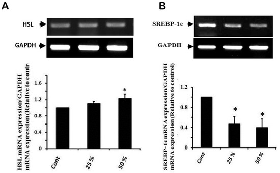 Effect of ginger water on HSL (A) SREBP-1c, (B) mRNA expressions in hepatic tissue of rats. Results of densitometric analyses and demonstrative blots of at least five independent experiments are displayed. Values are expressed as means ± SE. Cont: control, 25%:25% (v/v) ginger water-treated group, 50%:50% (v/v) ginger water-treated group. * p < 0.05 vs. the control.