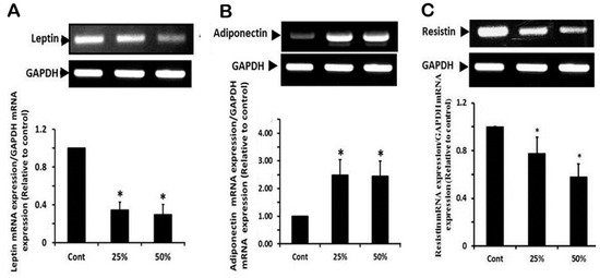Effect of ginger water on leptin (A), adiponectin (B), and resistin (C), and expression of mRNA in white adipose tissue of rat. Results of densitometric analyses and demonstrative blots of at least five independent experiments are displayed. Values are expressed as means ± SE. Cont: control, 25%:25% (v/v) ginger water-treated group, 50%:50% (v/v) ginger water-treated group. * p < 0.05 vs. the control.