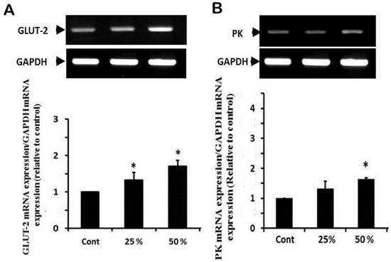 Effect of ginger water on GLUT-2 (A) and PK (B) mRNA expressions in the hepatic tissue of rats. Results of densitometric analyses and demonstrative blots of at least five independent experiments are displayed. Values are expressed as means ± SE. Cont: control, 25%:25% (v/v) ginger water-treated group, 50%:50% (v/v) ginger water-treated group. * p < 0.05 vs. the control.