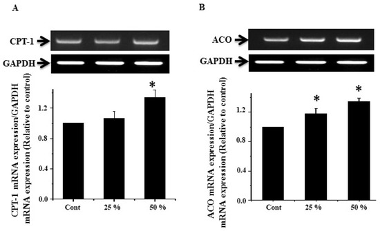 Effect of ginger water on CPT-1(A) and ACO (B) expression of mRNA in rat hepatic tissue. Results of densitometric analyses and demonstrative blots of at least five independent experiments are displayed. Values are expressed as means ± SE. Cont: control, 25%:25% (v/v) ginger water-treated group, 50%:50% (v/v) ginger water-treated group. * p < 0.05 vs. the control.