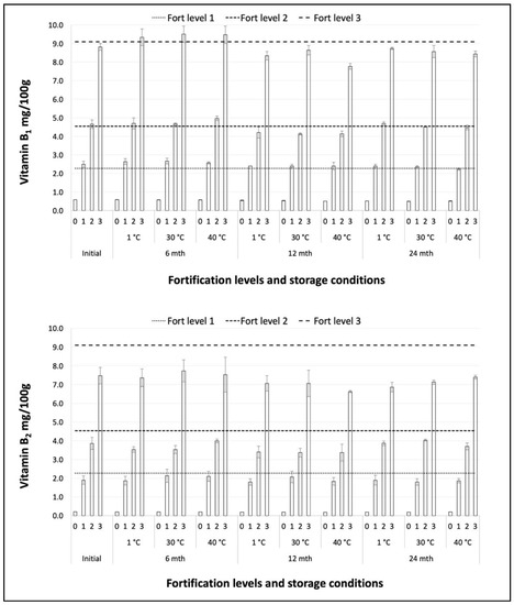Vitamins B1 and B2 storage stability at all levels of fortification (0, 1, 2, 3).