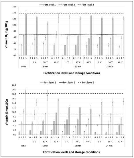 Vitamins B6 and E storage stability at all levels of fortification (0, 1, 2, 3).