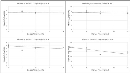 The vitamin levels at each stage of the storage trial are shown in Figure 1 and Figure 2. The levels of vitamins B1 and B2, both native and added, were stable at all temperatures throughout the storage study. Vitamin B6 exhibited slight losses during storage, whereas for vitamin E an overall downwards trend was clearer, but storage temperature was not a determinant of vitamin stability. Vitamin E results for all storage temperatures after 12 months of storage were lower than after 24 months of storage. The reason for this is not known, but there may have been an inconsistency in the application of the analytical procedure or conditions leading to relatively low results for the 12-month samples. Both native and added vitamin B6 and vitamin E exhibited the same behavior during storage. The levels of all vitamin levels during storage at 30 °C have been plotted and fitted with trend lines forced through the initial values as anchor points (Figure 3).