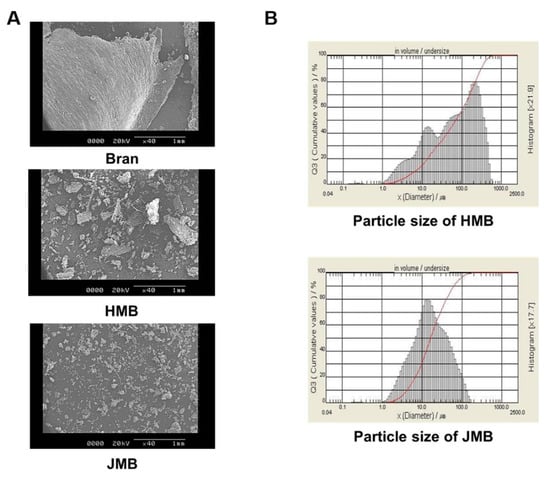 (A) Scanning electron microscopy (SEM, ×40) images and (B) particle size distribution of HMB or JMB. HMB: bran pulverized by hammer mill, JMB: bran pulverized by jet mill.