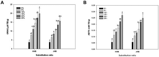 Effects of various substitution ratios of HMB or JMB on antioxidant activity of breads by (A) oxygen radical absorbance capacity (ORAC) and (B) 2, 2′-Azino-bis (3-ethylbenz-thiazoline-6-sulfonic acid (ABTS) assay. HMB: bran pulverized by hammer mill, JMB: bran pulverized by jet mill. Bars with different characters indicate a significant difference at p ≤ 0.05.