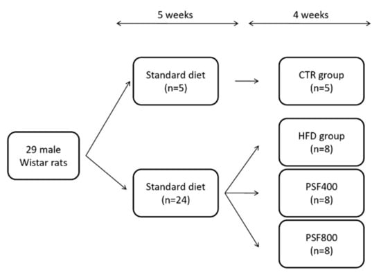 Male Wistar rats (200–230 g b.w.) were maintained with ad libitum access to food and drinking water for a 12 h light/dark cycle in cages at room temperature with the 55% relative humidity. Rats were divided into two groups: the control (CTR) group (n = 5), fed a standard diet (64% carbohydrates, 19% proteins, 7% minerals and vitamins, 6% fibers, and 4% fats; the fats percentage corresponds to the 11% of the diet-derived energy) and the high-fat diet (HFD) group, fed a high fat/cholesterol diet (48.7% carbohydrates, 28% fats, including 2% cholesterol, 13.8% proteins, 4.4% fibers, 5.1% minerals and vitamins, the fats percentage corresponds to the 55% of diet-derived energy). After 5 weeks, the animals of HFD group were treated with a single i.p. injection of streptozotocin (40 mg/kg) []. Twenty four rats, resulted to be diabetic with a plasma glucose concentration >250 mg/dL, continued to be fed a HFD diet for a further 4 weeks and were randomly divided into three groups: HFD (n = 8) group, PSF400 (n = 8) group, and PSF800 (n = 8) group (Figure 1). Rats from CTR and HFD groups were intragastrically administered the same volume of water; rats from PSF400 and PSF800 groups were intragastrically administered lyophilized PSF at different doses (400 mg/kg b.w. and 800 mg/kg b.w., respectively). The weight gain was calculated by initial and final weights. The rats were sacrificed and blood samples were collected by cardiac puncture under general anesthesia. Liver and brain tissues were stored at −80 °C. Hepatic lipids were quantified and oxidative stress markers were analyzed in liver and brain. Blood was centrifuged (2300× g for 15 min) to obtain serum samples for laboratory analysis. Local Ethical Committee approved all animal procedures in accordance with the European Communities Council Directive of 24 November, 1986 (86/609/EEC).