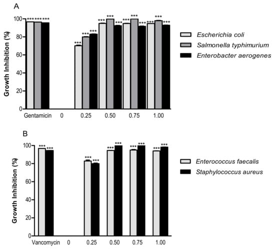 Growth inhibition effect of PSF extract (0, 0.25, 0.50, 0.75, and 1.00 mg/mL) against Gram-negative bacteria (A) (Escherichia coli ATCC 25922, Salmonella enterica ser. typhimurium ATCC 14028, and Enterobacter aerogenes ATCC 13048) and Gram-positive bacteria (B) (Enterococcus faecalis ATCC 29212 and Staphylococcus aureus ATCC 25923). Significantly different from negative control (PSF 0 mg/mL): *** p ≤ 0.001. Results are reported as means (n = 3) values ± standard deviation.