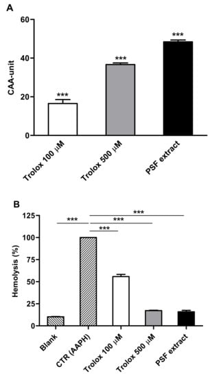 (A) Effects of PSF extract (100 mg/mL) on cellular antioxidant activity (CAA) in human erythrocytes. Significantly different from untreated cells (CAA unit = 0): *** p ≤ 0.001. (B) Effects of PSF extract (100 mg/mL) on dihydrochloride (AAPH)-induced oxidative hemolysis in human erythrocytes. Significantly different from CTR (AAPH-treated cells): *** p ≤ 0.001. Trolox was used as reference standard. Results are reported as means (n = 3) values ± standard deviation.