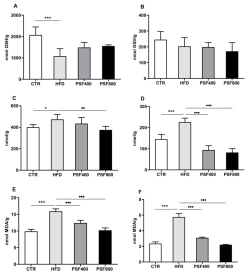 The high-fat diet was probably responsible for the decrease of GSH (Figure 4A) content and the increase of protein carbonylation (Figure 4C) and MDA (Figure 4E) levels in the liver samples of HFD rats, compared with the CTR group. Moreover, while hepatic GSH content was not affected by PSF treatment (Figure 4A), administration of PSF improved the oxidative stress status of rats according to the protein carbonylation, at the higher concentration of treatment (800 mg/kg b.w.) (Figure 4C), and to the MDA content, in a dose-dependent manner (Figure 4E). It has been demonstrated that plant polyphenols are related to the improvement of hepatic oxidative stress caused by a high-fat diet through the e activation of Nrf2 transcription factor, which increases expression of antioxidant enzymes []. Moreover, it was reported that even the single polyphenol, if isolated, can improve the high-fat-diet-induced hepatic oxidative stress, as in the case of rutin [] and gallic acid [].