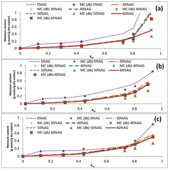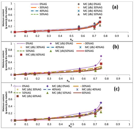 Effects of acacia gum concentration on the equilibrium moisture sorption isotherm of date syrup powders at 25 °C. The experimental data are presented as symbols and the data obtained by fitting the experimental data into mathematical models are presented as lines. (a–c) represent the obtained data from BET, GAB, and Peleg models. 0% AG: 100% DS-0% AG; 30% AG: 70% DS-30% AG; 40% AG: 60% DS-40% acacia gum; 50% AG: 50% DS-50% AG; 60% AG: 40% DS-60% acacia gum; DS: date syrup; AG: acacia gum.