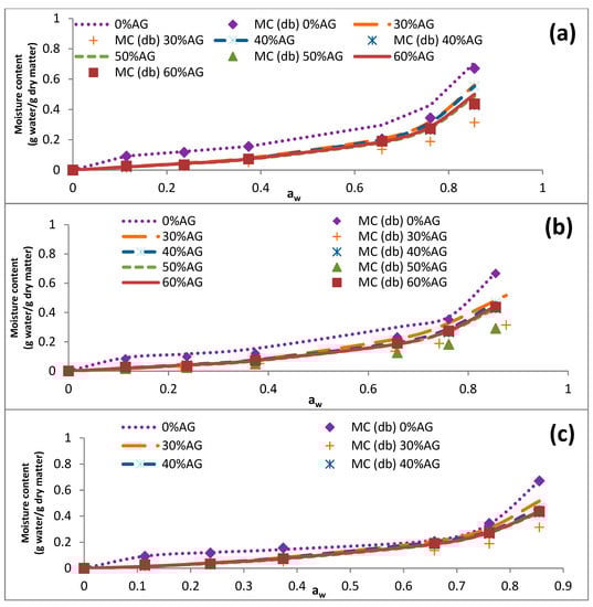 The GAB model yielded average Me values of 8.46% (ranging from 7.00% to 9.22%), 8.03% (ranging from 5.89% to 10.22%), 8.82% (ranging from 8.06% to 9.84%), 7.48% (ranging from 6.08% to 8.60), and 7.79% (ranging from 5.66% to 8.89%) for DS powders containing 0% (control sample), 30%, 40%, 50%, and 60% AG, respectively. Furthermore, Peleg models yielded average Me values of 8.07%, 7.98%, 7.71%, 6.74%, and 3.8% for DS powders containing 0%, 30%, 40%, 50%, and 60% AG, respectively. Moreover, average Me values of 15.38%, 17.23%, 16.33%, 19.04%, and 19.21% were obtained from the BET model for DS powders containing 0%, 30%, 40%, 50%, and 60% AG, respectively. These findings were in agreement with that documented by Aviara et al. (2006), who mentioned that only relying on RSS and SEE is an inappropriate approach to determine the suitability of a model for fitting experimental moisture sorption isotherms [37]. It seems that the GAB and Peleg equations gave the most appropriate fit for the sorption isotherms of the studied samples with a wide range of aw according to the SEE, RSS R2, and Me values (Table 6). This also indicates that the BET model was not able to describe the water activity-EMC well in DS powder, indicating the phenomena of dissolution may predominate over sorption. Therefore, concentrations of the monolayer water (M0) at various temperatures were obtained through these two models. The M0 values of the DS samples were higher than those of the AG-containing samples. Higher concentrations of AG resulted in smaller amounts of M0. This was the case for both the GAB and BET models at all the studied temperatures. AG has the role of an effective anti-plasticizer in the present study. This anti-plasticizer has a larger size and a higher molecular weight than small sugar molecules of DS. These characteristics of AG can decrease the monolayer water level by reducing the overall ratio of interaction sites.