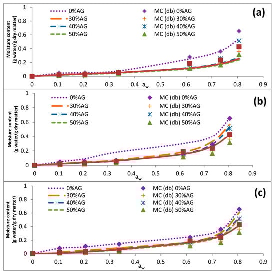 Effects of acacia gum concentration on the equilibrium moisture sorption isotherm of date syrup powders at 40 °C. The experimental data are presented as symbols and the data obtained by fitting experimental data into mathematical models are presented as lines. (a–c) represent the obtained data from BET, GAB, and Peleg models. 0% AG: 100% DS-0% AG; 30% AG: 70% DS-30% AG; 40% AG: 60% DS-40% acacia gum; 50% AG: 50% DS-50% AG; 60% AG: 40% DS-60% acacia gum; DS: date syrup; AG: acacia gum.