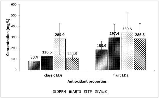 The analyzed classic EDs were characterized by low pH, ranged from 3.18 to 3.66 (Table 1). The fruit-enriched EDs had a slightly lower pH, ranged from 2.32 to 3.60. Seven of the ten fruit EDs had a pH less than 3.0. The high acidity of EDs could be caused mainly by their content of vitamin C. The classic EDs contained 75 mg/Kg to 150 mg/Kg of sample (expressed as AA). The fruit EDs had significantly (p ≤ 0.05) more vitamin C, from about 150 mg/Kg to over 500 mg/Kg (except samples F9 and F10; Table 2). Furthermore, the low pH of all EDs was due to the presence of acidity regulator, i.e., citric acid and/or sodium citrate. The content of these acids in EDs increased the antioxidant effect.