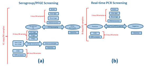 Analysis workflow and turnaround time to analyze 96 samples. Cases (a) and (b) show time of analysis applying serogroup and PFGE and real-time PCR as screening test to perform outbreak inclusion/exclusion, respectively.