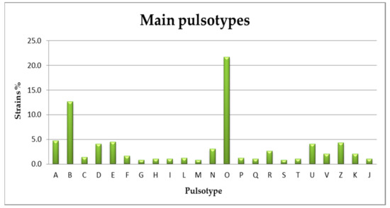 The PFGE analysis was carried out on 490 strains with both the enzymes and yielded 97 combined pulsotypes in addition to the outbreak profile that represented the prevalent one (21.6%) (Figure 2).
