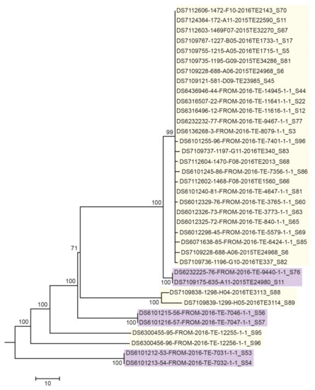 - Quainoo, S.; Coolen, J.P.M.; van Hijum, S.A.F.T.; Huynen, M.A.; Melchers, W.J.G.; van Schaik, W.; Wertheim, H.F.L. Whole-Genome Sequencing of Bacterial Pathogens: The Future of Nosocomial Outbreak Analysis. Clin. Microbiol. Rev. 2017, 30, 1015–1063. [Google Scholar] [CrossRef]