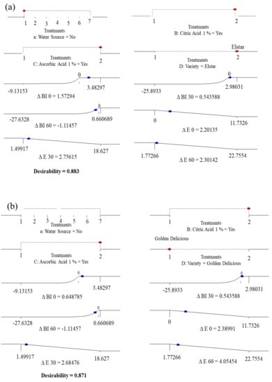 Numerical optimization for surface colour development of Elstar (a) and Golden Delicious (b) slices subjected to treatments and exposure to air at room temperature for 0, 30 and 60 min. Red dot = factors; blue dot = responses. Climbing up the response ramps means more desirable value.