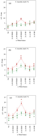 Figure 3 showed trends of luminance (L*) for both Golden Delicious and Elstar slices before applying treatments (Figure 3a) and after applying treatments measured at 0, 30 and 60 min (Figure 3b–d).