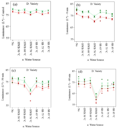 Changes in luminance (L*) on slices (cv. Golden Delicious [red colour] and Elstar [green colour]) before applying treatments (a) and at 0 (b), 30 (c) and 60 min (d) of air exposure. No = no physical and/or chemical treatments (control); HWB = hot-water blanching; SB = steam blanching; X1 = a: Water Source; X2 = D: Variety; B: Citric acid 1% = No; C: Ascorbic acid 1%= Yes; red point = D1 Golden Delicious; green point = D2 Elstar.