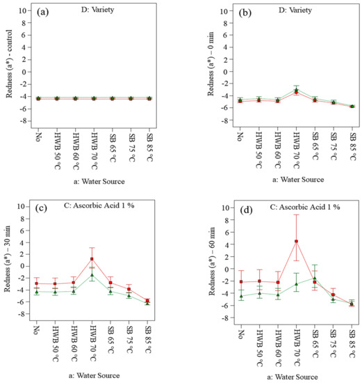 Changes in the redness (a*) on slices (cv. Golden Delicious and Elstar) before applying treatments (a) and at 0 (b), 30 (c) and 60 min (d) of air exposure. No = no physical and/or chemical treatments (control); HWB = hot-water blanching; SB = steam blanching; X1 = a: Water Source; X2 = D: Variety; B: Citric acid 1% = No; C: Ascorbic acid 1%= Yes; red point = D1 Golden Delicious; green point = D2 Elstar.