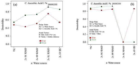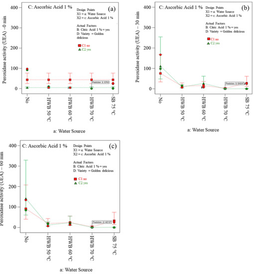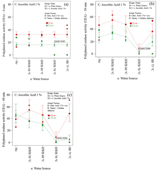 Table S1 (see the Supplementary Materials) presents the ANOVA, where the cultivars show a significant effect on PPO and POD and colour parameter (L* and b*) at 0 min, 30 min and 60 min air exposure timing. However, the a* parameter at 0, 30 and 60 min was not significant for both cultivars. Water blanching showed a significant effect in 30 min and 60 min waiting time for PPO and POD activity and all CIELab colour parameters. The effect of ascorbic acid was significant on most of the responses except for L* and b* at 0 min air exposure timing. Citric acid and interaction effect (ascorbic acid-variety, water source-variety) were non-significant for most of the responses, except POD, thus these factors were eliminated from the model in compliance with the hierarchy approach.