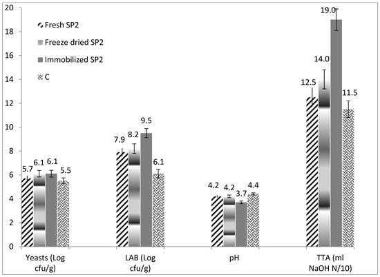 Viable cell counts (log cfu/g) of yeasts and lactic acid bacteria (LAB), total titratable acidity (TTA), and pH values of the sourdoughs prepared with frsh P. pentosaceus SP2 cells (Fresh SP2), with freeze-dried P. pentosaceus SP2 cells (Freeze-dried SP2), with immobilized freeze-dried P. pentosaceus SP2 cells (Immobilized SP2), and commercial sourdough with wild microbiota (C), after incubation at 30 °C for 24 h.