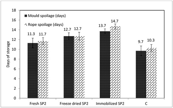 Resistance against rope and mold spoilage of breads made with sourdoughs containing P. pentosaceus SP2 cells (Fresh SP2), freeze-dried P. pentosaceus SP2 cells (Freeze-dried SP2), immobilized freeze-dried P. pentosaceus SP2 cells (Immobilized SP2), as well as with the commercial sourdough (C).
