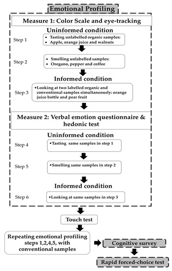 The emotional profiling design was developed in the following way. First, taste and smell tests took place respectively in uninformed conditions with unlabeled organic food samples and with no information about the nature of the sample. Next, a visual test in informed conditions took place with a simultaneous serving of organic and conventional labelled samples of the same type. After that, participants underwent a touch test. Then, participants repeated the taste and smell tests with unlabeled conventional samples. The implicit food-elicited emotions were measured first using the color scale with eye-tracking, while the explicit food-elicited emotions were measured after using a verbal emotion questionnaire.