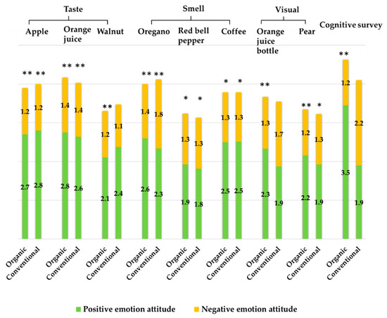 In terms of organic samples, positive elicited emotions towards all organic samples in the emotional profiling were significantly lower (p < 0.05) than the declared positive emotions towards organic food in the cognitive survey. Nevertheless, there were no significant differences in negative emotions between the cognitive survey and the emotional profiling except for orange juice sample in the taste test.