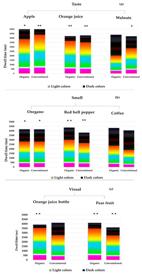 Dwell time in milliseconds on light colors and dark colors to express implicit food-elicited emotions towards organic and conventional samples in the emotional profiling using the color scale. The display time of the color scale on the screen lasted for 5000 ms. (*) Significant differences in dwell time between light colors and dark colors (* p < 0.05, ** p < 0.01). (a) The results of the taste test, (b) smell test, and (c) visual test.