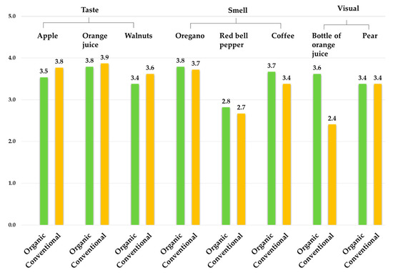 As shown in Figure 4, no significant differences in overall liking between organic and conventional samples were found with all the samples except for the orange juice bottles. The taste of conventional samples was slightly more liked by consumers than the taste of the organic ones, while the smell of the organic samples was slightly more liked than the conventional ones. In the informed emotional profiling, consumers liked the organic orange juice bottle significantly more than the conventional juice bottle (p < 0.05), while they liked both the organic and conventional pear fruits almost the same.