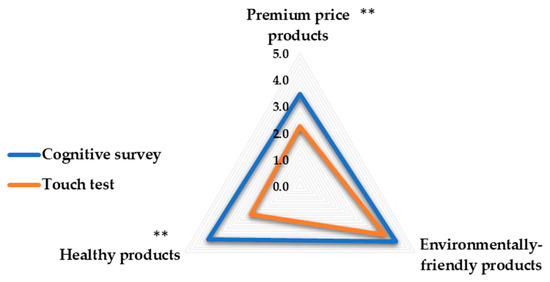 Figure 5 illustrates the comparable results between the participants’ perception of the three mentioned aspects. Significant differences between the responses in the cognitive survey and touch test were found in premium price and health aspects. Participants rated those two aspects in the cognitive survey higher than in the touch test.